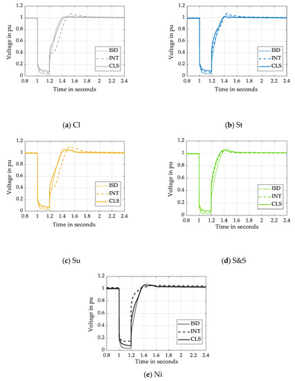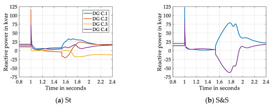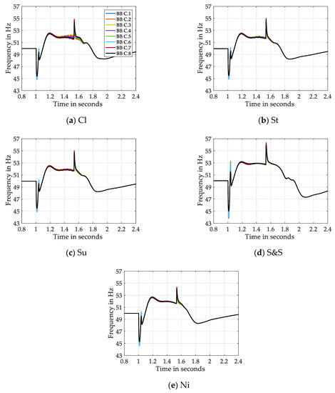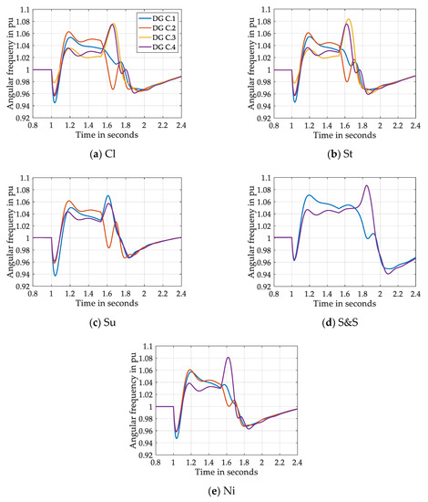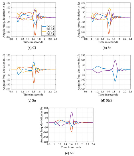 Before performing dynamic short-circuit analysis, microgrid C, along with the other two microgrids, in the islanded mode was verified according to the ISO norm 8528-5 [32,33] with respect to the five scenarios—both in the steady-state and with sudden step-load change. The latter is performed by increasing as well as decreasing the actual power consumption of the static loads—at the studied operating point—up to 40% and 90%, respectively. According to [17], a significant reduction in the solar irradiance of ca. 55% within 2.5 s does not have negative consequences in the analyzed clustered microgrid model comprising DG and PV, which is similar to the microgrid model in scenario “sun”.