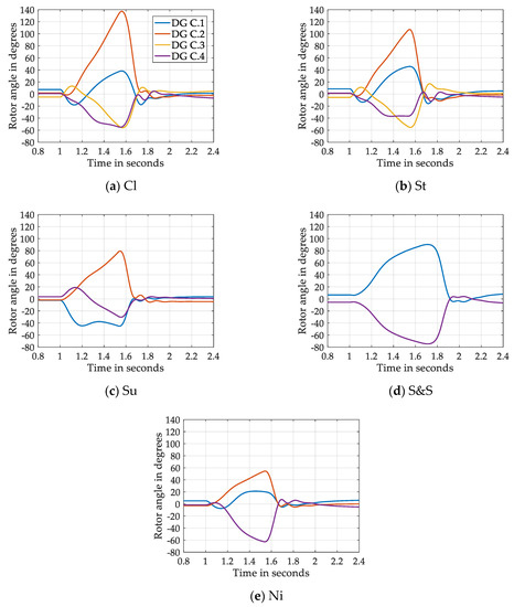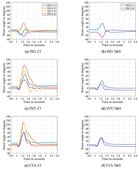 Large-signal rotor angle stability of clustered microgrids with synchronous generators should be analyzed both in the short-term and long-term planning phase as well as in the operation [14,15]. A detailed dynamic microgrid modelling and knowledge of system response in case of three-phase faults—especially critical faults—are essential for an effective qualitative TSA, which is performed with the help of time-domain simulations (TDS) [14,16]. The qualitative TSA of microgrids comprising diesel generators (DGs) and PV, acting as current sources as well as static loads (SL) was investigated taking different microgrid models in [17] and [18].