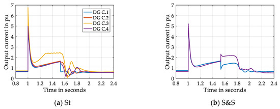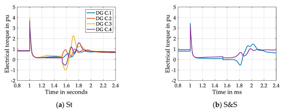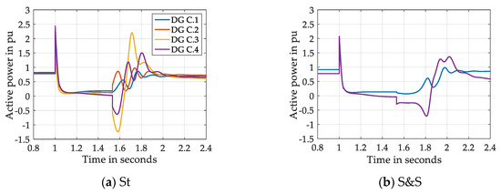 If the bus voltage drops below 0.15 pu, inverter-based systems can be disconnected from the system according to [45]. Further, DGs can be tripped in case of a voltage drop of 0.3 pu or less [45]. However, DGs, PV, and BSS were purposely not disconnected in this research work—irrespective of the bus voltage. On the other hand, induction motors, i.e., dynamic loads, were tripped 40 ms after the fault occurrence using undervoltage protection [46]. Soon after the fault incident, induction motors will provide subtransient short-circuit currents (similar to DGs), which are beneficial also in microgrids. However, the reactive power demand of induction motors during the fault-on and the post-fault time period can be very critical in microgrids and also can lead to voltage or system collapse.