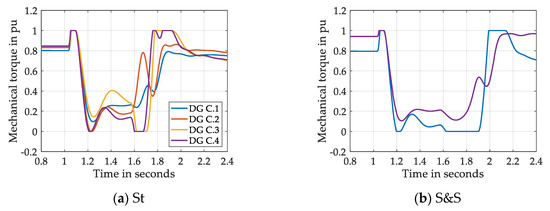 The short-circuit behavior of the classical and the hybrid microgrids in the islanded mode was studied—before performing qualitative and quantitative TSA—not only at the system level, but also at the equipment level. First and foremost, the measured voltage and frequency on the buses were compared regarding the scenarios. The considered variables of DGs are relative rotor angle (i.e., rotor angle in the center of inertia frame, COI), actual rotor angular frequency, and relative rotor angular frequency deviation. Furthermore, electrical and mechanical torque of DGs were also analyzed taking “storage” and “sun & storage” (comprising DGs, PV, and BSS) into account.
