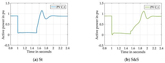 For equal to 2.4 the control system was analyzed to be stable based on the Bode magnitude and phase plot as well as the step response. However, the resulting values of and lead to unacceptable oscillations in the investigated microgrids. The calculated values of and were therefore exemplarily divided and multiplied by a factor of 15 and 1000, respectively. The resulting grid simulations (without any fault or disturbance) were acceptable and plausible. The values of and of the PV systems for scenario “storage” with respect to the different operating modes are listed in Table 5.