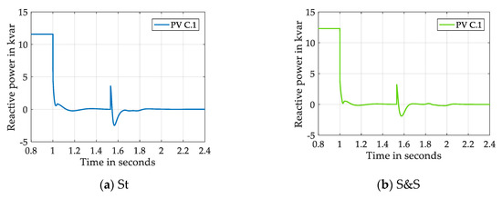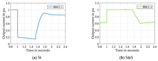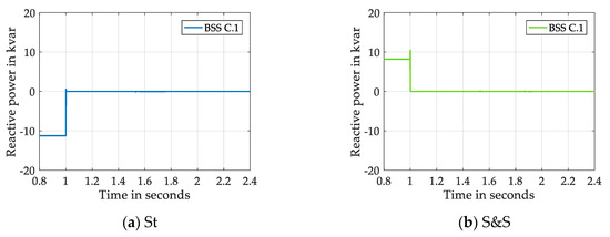 Long-lasting oscillations were observed in grid simulations for the calculated values of and —like in PV systems. Hence, and were exemplarily multiplied by a factor of 1.5 and 3000, respectively. Consequently, no oscillations were noticed. Table 8 lists the values of the parameters in the voltage controller of BSS in scenario “storage” regarding the three different operating modes.