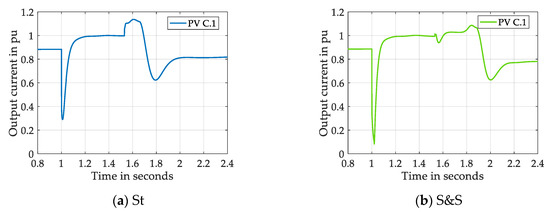 PV systems were modelled considering the DC-side. The dimensioning of the main components of PV systems—PV generator, DC-link capacitor, and L filter—has been explained in [17]. In this research work, each microgrid comprises one PV system. The nominal active power of PV A.1 is 60 kW and PV B.1 and C.1 is 44 kW, with a constant power factor of 0.95 (cap.). Each PV generator is made up of 28 modules in series and 6–9 modules in parallel—belonging to Sharp® NQ-R258H [24]. The employed inverters are Sunny TP 60 and Sunny TP Core1 [25,26]. The investigated day was assumed to be a partly sunny day in a tropical country, where the solar irradiance and the PV module temperature is equal to 1000 W/m2 and 60 °C, respectively. On the other hand, the DC-side of BSS was not considered in the framework of this research work. The inverter of BSS was connected to an ideal DC voltage source. The nominal power of BSS A.1 and BSS B.1 and C.1 is 56kW and 41 kW, respectively, with a power factor of 0.95 (cap.). The dimensioning of the controllers used in the grid-feeding PV systems and grid-forming BSS will be described in Section 2.3.