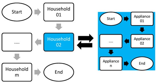 A prominent feature of the bottom-up model is that it can be used to analyze the load behavior of each individual subscriber. Figure 1 illustrates the logic used for modeling. The daily load curve is actually created by repeating two loops. In the first loop, after choosing the type of household, a load curve will be created for each of the equipment in the house. This procedure is repeated in the second loop for all the equipment and the cumulative consumption curve is added to the previous curves to obtain the final household load curve. The appliance list varies from house to house, so a coefficient is defined as the level of saturation that indicates the likelihood of a particular home being equipped with a particular appliance (). In fact, for a large number of homes, this coefficient gives the frequency of a particular home appliance. For example, a saturation level of 0.93 for an appliance in 100 residential homes means that there are 93 units of that special equipment in the 100 homes [13].
