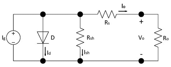 where is the output current of the PV module, is the number of cells in parallel, is the current generated by solar radiation, is the reverse saturation current, is charge of an electron, is the output voltage of PV module, is the ideality factor of the diode, is the Boltzmann’s constant and is the current due to intrinsic shunt resistance of the PV module.