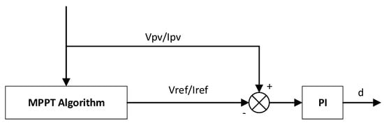 At any given moment, the MPPT checks the zero-sum requirement of dI/dV and I/V. If the resultant is not zero, the proportional-integral (PI) controller considers the value of the product as error and minimizes it. The value at the output of the PI controller is the amount of change required in the duty cycle. This value is added to the current duty cycle value. For better convergence, the initial value of duty cycle has been set to 0.75 by trial and error. The concept of the proposed controller is shown in Figure 3.