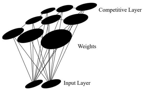 The SOM network uses competitive learning to train and is developed based on specific characteristics of the human brain. The cells in the human brain are organized in different areas so that in different sensory areas they are presented with meaningful computational maps. Self-organized networks are structurally divided into several categories in which we used the Kohonen network in this study. The SOM is an unsupervised neural network composed of neural neurons in a regular, low-dimensional grid structure. Each neuron has an n-dimensional weight vector where n is the dimension of the input vectors. Weight vectors (synapses) attach the input layer to the output layer. This is called the output layer, map or competitive layer. The neurons are connected by a neighborhood function (as shown in Figure 4). Each input vector, by most similarity, activates a neuron in the output layer called the winning cell. The similarity is usually measured by the Euclidean distance between two vectors [48].
