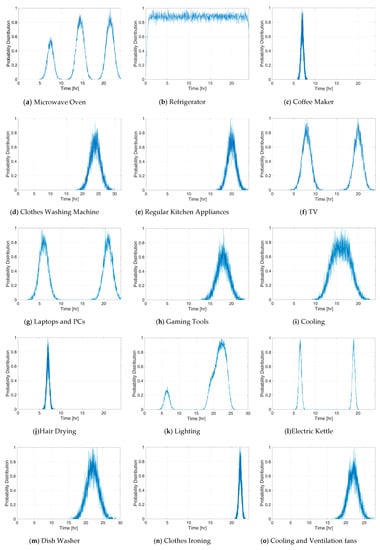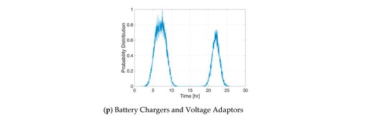 The start-on probability distribution of home appliances. (a) Microwave Oven; (b) Refrigerator; (c) Coffee Maker; (d) Clothes Washing Machine; (e) Regular Kitchen Appliances; (f) TV; (g) Laptops and PCs; (h) Gaming Tools; (i) Cooling; (j) Hair Drying; (k) Lighting; (l) Electric Kettle; (m) Dish Washer; (n) Clothes Ironing; (o) Cooling and Ventilation fans; (p) Battery Chargers and Voltage Adaptors.