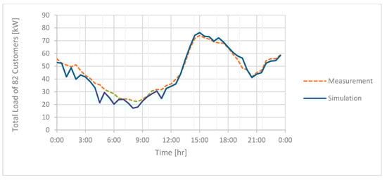 Figure 9 illustrates the comparison between simulation results and measurement results in the sample grid with the specifications given in Table 1 to validate the model. Measurement results belong to the mean days of 16 July to 10 August 2019 [53]. Due to the different behavior of subscribers on holidays and semi-holidays, weekends are omitted on average load behavior calculations. Simulation results are obtained with one-minute accuracy, but they need to be calculated in the form of 30 min sets, since the measurements were made in 30 min intervals.