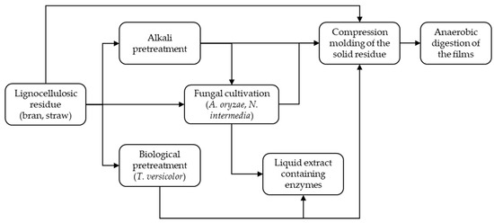 In this paper, the production of bio-based materials from wheat bran and straw was studied. The effects of an alkali pretreatment, the growth of the white-rot fungus Trametes versicolor, and the cultivation of the filamentous fungi Neurospora intermedia and Aspergillus oryzae on the mechanical characteristics of the materials and their biodegradability were investigated. Lastly, the recovery of the enzymes produced by the fungi during solid-state fermentation was investigated. A summary of the steps involved in this study are presented in Figure 1. The utilization of the wheat byproducts for the production of material, enzyme, and fuel (biogas) was shown through a bioprocess route.