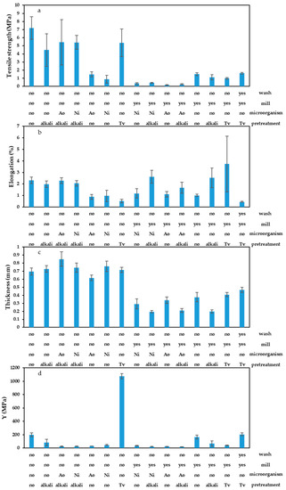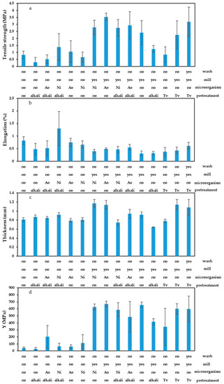 Pressing of the raw or fermented byproducts yielded bad quality materials, whose edges were not well aggregated, as shown in Supplementary Figures S1 and S2. Therefore, experiments were also conducted with the material milled to a powder (<0.2 mm) and mixed with glycerol, which acted as the plasticizer. Results of the tensile strength (σb, MPa), the elongation at break (εb, %), the thickness (mm), and the Young’s modulus (Y, MPa) of the films are presented in Figure 2 for wheat bran and Figure 3 for wheat straw. The maximum tensile strength obtained was 7.2 MPa for the bran film (raw, not milled). Generally, although the edges of the films were better aggregated when the bran was milled, the tensile strength for these films decreased. On the other hand, for the films made with straw, the milling of the material improved the tensile strength—the highest one being observed for the raw straw cultivated with A. oryzae and milled (3.5 MPa). Comparatively, high-density polyethylene [24] and low-density polyethylene [25] have been reported to have tensile strength around 21 and 11 MPa, respectively. All the films presented elongation at break below 3%, except for the bran pretreated with T. versicolor and milled (3.7%).