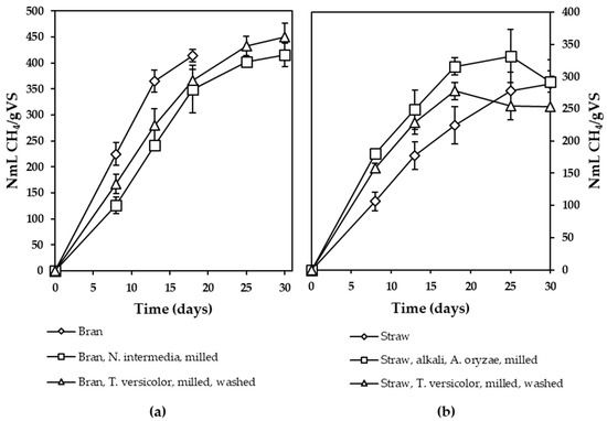 Cumulative methane production during the anaerobic digestion of the bio-based materials made of (a) bran and (b) straw.
