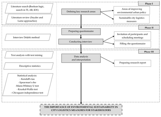 While designing the method for this study, the main assumption was the necessity to implement a multi-method approach (see Figure 1). Firstly, to create the interview questionnaire, a literature review was required to draw a picture of the specified research area. The aim of the review was to define the environmental sustainability elements for city logistics measures. For this purpose, the approaches of Snyder [60] and Lame [61] were implemented. This part of work was executed in October 2019 with use of the keywords search (“city logistics measures” and “environmental sustainability” in title, abstract, or keywords) in different scientific search engines (as the primary engines—SCOPUS, ScienceDirect, EBSCOhost, and MDPI, and as the auxiliary engine—Google Scholar). The search results were limited to the social sciences discipline. The resulting literature database was refined using the abstract search and this way the basic literature base was set. Then, with use of the Mendeley Desktop, the content analysis was performed, which resulted in indicating the main environmental sustainability criteria. Eventually, just 21 papers were taken into consideration in the analysis of the assessment procedure, and indicated the individual, specific variables (see Table 1 and Table 2). Those, in turn, built one of the areas of the interview questionnaire. The literature review results were placed in Table 1 in the previous section and Table 2. Then, the interview was conducted in November 2019. The next research phases were based on text analysis, text mining, and the statistical analysis, namely the tools characteristic for assessing the relations between nominal and ordinal variables. Taking into consideration the character of the variables, a few procedures were applied (see Section 4.2 and Section 4.3). This part of the study was held in January 2020.