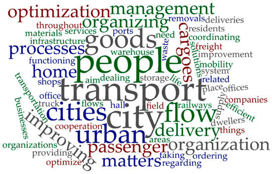 The first question had to determine how the stakeholders understood the city logistics issues. As presented in Figure 2, there are some areas associated mainly with city logistics. Firstly, the city logistics, according to the opinions of respondents, relates to processes and objects of interest to those processes. Namely, it contains such processes as management, optimization, organizing (organization), and improving, mainly with regards to transport. The objects of such actions are mostly people, goods (cargoes, freight), their flows, deliveries, and supply area. According to the raw data (see Appendix B, Table A3 and Table A4), its main area is organizing and—broadly speaking—improving flows within urban areas. Therefore, the group of all respondents sees city logistics primarily as managing the operations held within the city.