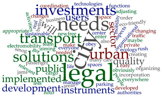 The fourth question was “What kind of measures can influence the reduction of negative impacts of transportation in cities?” and aimed at identifying the crucial areas that need to be improved within urban policy. The open character of the question allowed the participants to speak freely. However, they did not indicate many areas in this regard (see Appendix B, Table A5 and Table A6), even if there was no limit of time and no closed collection of possible answers. The homogenous opinions express the main areas for improvement (see Figure 3). The most popular answer concerned the legal issues, for example regarding the access of trucks to the city center, to zones free from any motorized mobility, to special delivery zones, logistics consolidation center, and electromobility. Another answer often mentioned areas with investments in different parts of the urban space: eco-friendly solutions, public transport and others, precisely speaking—investments made for city users, to adjust the city functions to their needs. Among those, environmental sustainability elements can also be noticed: technology, broad term “ecology”, reduction of smog, sustainable development investments, and the development of electromobility. The most-often mentioned legal regulations can also be a part of environmental sustainability policy, because they usually impose some limits on the allowance for cars or truck with required ecological class, or will simply bar entry to some parts of the city, charge entry fees, etc.