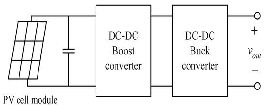 The PV system is divided into two essential parts: the PV cell module and the conversion circuit. The proposed PV system in this paper uses a two-stage topology structure, as shown in Figure 1. The first DC-DC boost converter matches the output impedance of PV cell module with the load impedance and tracks the maximum power point. Then, the stable output voltage can be obtained by the second DC-DC buck converter to supply electricity for the load.
