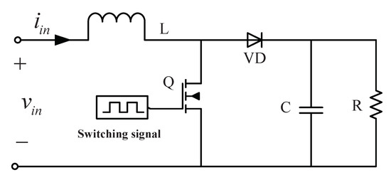 The DC-DC converter is used to achieve the MPPT and output voltage regulation of the PV cells. The boost converter is chosen as an example in this section, which can switch the two operation states (ON and OFF) under high frequency. The circuit topology of the DC-DC boost converter is shown in Figure 2.