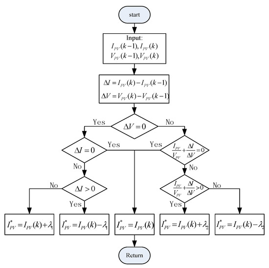Then, by taking the appropriate step size at current time k, the output current reference of the PV cell at next time can be obtained. The proposed dual step I&C method to determine reference current is shown by the flowchart in Figure 3, in which and represent the different step sizes, and they are set to be and to reduce oscillation.