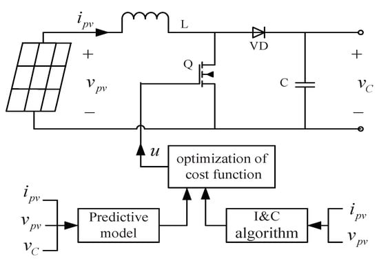 With the development of renewable energy sources, solar energy, as a widespread and clean energy, has attracted the scientific and industrial interest in recent years. The applications of the distributed photovoltaic system and DC microgrid increase the utilization of solar energy. Meanwhile, the rise of the power electronic technology (e.g., DC-DC conversion) further extends the research boundaries of the photovoltaic system and improves the efficiency of energy conversion [1,2]. However, the rapid change of environmental conditions still has a harmful effect on efficiency and stabilization of PV system. In addition, to inject the generated PV power into the grid with high quality, the output voltage of the PV system also needs to be regulated. Hence, for the PV system, it is necessary to solve the maximum power point tracking and output voltage regulation issues. Many studies have researched the MPPT control issue of the PV system in recent years [3,4,5,6,7,8,9,10,11,12]. The MPPT methods for the PV system are summarized and compared in [13]. As the traditional MPPT technology, Perturbation and Observation (P&O) and Incremental Conductance (I&C) are the most extensively used in PV MPPT system [14], which can combine Grey Wolf Optimization (GWO) [15] or Particle Swarm Optimization (PSO) [16], but an obvious oscillation can appear at maximum power point (MPP). The fuzzy logic control (FLC) method without precise model is presented in [17] and genetic algorithm (GA) based FLC is used in [18] to achieve the optimum control. However, the drawback of fuzzy-based MPPT algorithms is that the tracking point is located away from the MPP when the weather conditions change [19]. Recently, the model predictive control has been used for MPPT of the PV system. The MPC-MPPT algorithm is considered in one-step horizon to enhance tracking performance [20,21,22,23]. Furthermore, the number of the required sensors for the MPC controller is minimized. In [24], the MPC-based MPPT is designed for PV system with pulse width modulation (PWM) module, which increases the complexity of DC-DC converter. By estimating the equivalent voltage and resistance of the PV module, the predicted PV power is calculated for ON or OFF state. However, the above MPC-based MPPT need to predict the instantaneous value in ON or OFF state, rather than the average value in the whole switch cycle via one cost function, which can cause prediction errors if sampling time is not short enough.