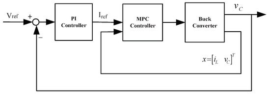 According to the average current control method, the MPC objective is that the inductor current can always be maintained at reference current , while the input constraints are satisfied. The total block diagram for voltage regulation with buck converter is shown in Figure 5.
