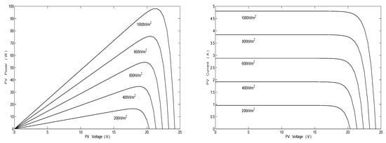 As an example, the PV module composed of three cell in series on the basis of STP0950S-36 PV array was considered. The parameters of each PV cell and the DC-DC converter are shown in Table A1 in Appendix A. According to the PV model in Equation (2) in Section 2.1, each PV cell power and current characteristics under different illumination intensity at 25 C are shown in Figure 6.