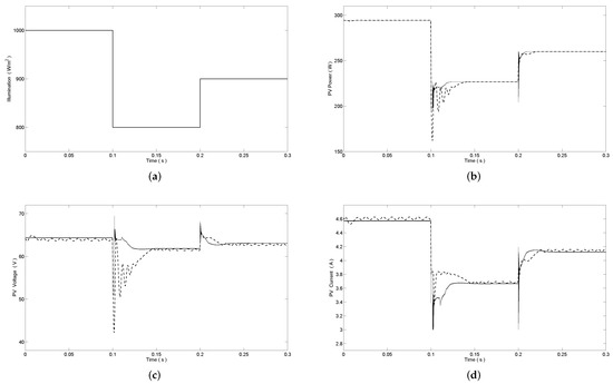 (a) The illumination variation; (b) corresponding output power; (c) output voltage of PV module; and (d) output voltage of DC-DC buck converter (proposed method (―), traditional P&O and PI cascade control ()).