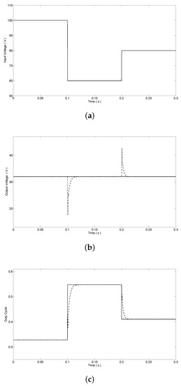 (a) The input voltage; (b) corresponding output voltage regulation; and (c) duty cycle input of DC-DC buck converter (proposed voltage regulation method (―), PI cascade control ()).