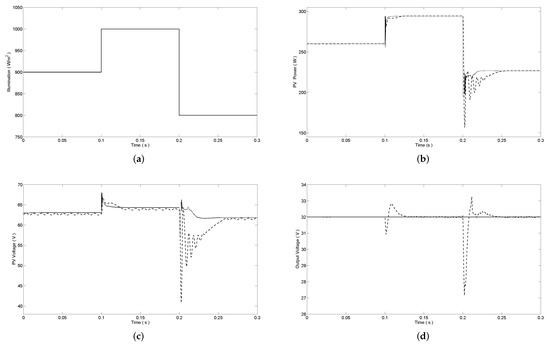 The simulation of the MPPT and voltage regulation of the PV system was studied next. The reference output voltage V was chosen and the simulation results are shown in Figure 10. The illumination intensity changes from 900 W/m to 1000 W/m at time s and changes from 1000 W/m to 800 W/m at time s, as illustrated in Figure 10a. For comparison, we combined the traditional P&O algorithm for MPPT and the PI cascade control method for voltage regulation to design the combined controller. The simulation results of the traditional P&O and PI cascade control for two-stage PV system are also illustrated in Figure 10 as dashed lines. In Figure 10b, we can see that the proposed MPPT method tracks the maximum power point of the PV module at 0.107 s and 0.222 s under the variation of illumination intensity, respectively. The overshoot of PV power for the proposed MPPT scheme is smaller than the traditional P&O algorithm. In Figure 10c, the ripple of PV voltage is smaller comparing with the traditional PI cascade control method. Meanwhile, as shown in Figure 10d, the output voltage of proposed PV system is always maintained at 32 V without overshoot, while the overshoot of output voltage for traditional P&O and PI cascade control is 1.17 V and 5.05 V, respectively, which verifies the effectiveness of the proposed MPPT and voltage regulation methods.