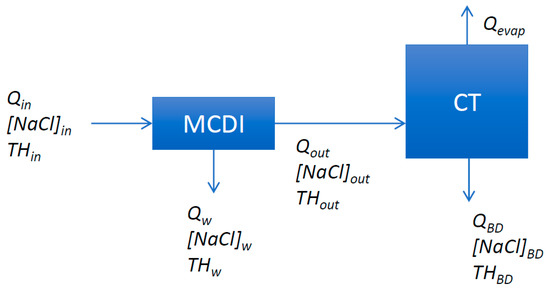 Process scheme for membrane capacitive deionization (MCDI) pretreatment of cooling tower including mass balance components flow (Q), [NaCl] and hardness (TH) for MCDI feed (in), product (out) and waste (w) and cooling tower evaporate (evap) and blowdown (BD).