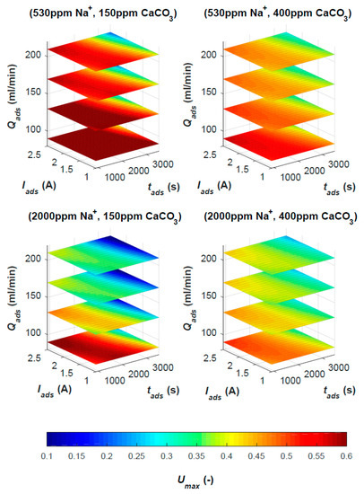 4D volume plots of maximal utilization (Umax) for 4 feed water qualities ([Na+], TH). Umax is given as colormap slices in the volume plot of flowrate (Q), current (I) and duration (t) for MCDI adsorption phase.