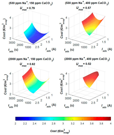 Estimated cost is determined from energy consumption and required electrode surface (Equation (4)). Both parameters depend largely on flowrate. Increasing Qads causes specific energy consumption (SEC) and Ael to lower causing Cost to decrease. With increasing flowrate also Umax decreases which makes it of interest to optimize Umax and Cost in terms of Iads and tads. MCDI Cost is made relative to CT evaporate flow to allow comparison of cooling capacity for the 4 previously defined feed water types. Iso-surfaces are plotted which represent a single optimal Umax value as a function of cost (€ m−3evap.), Iads and tads (Figure 3).