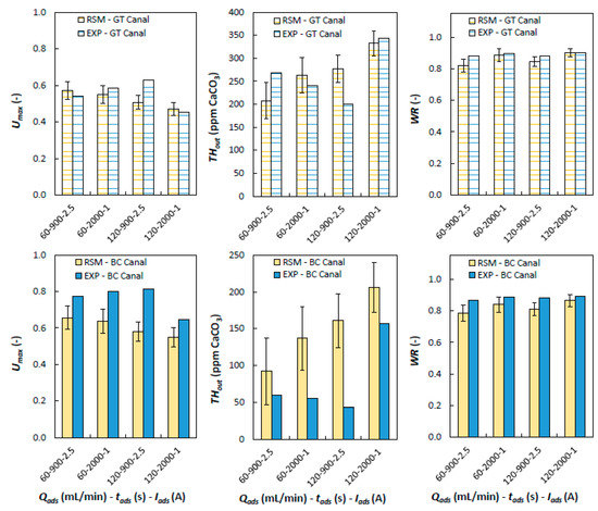 Comparison of Umax, WR and THout derived from RSM (±95% CI) and experimental values for GT Canal (Top) and GT Canal (Bottom) feed water.