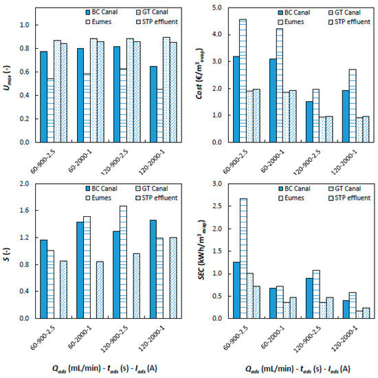 Umax is found to be highest for Eumes river water followed by STP effluent, BC Canal and GT Canal feed water types. This expected as Umax is inversely correlated with feed water EC and TH following their effect on THout. Variation of Umax among process conditions is small, except for BC Canal and GT Canal feed water where ((tads, Iads):(2000 s, 1 A)) Umax is lower in comparison to other test conditions. This is also mirrored in Cost (€ m−3evap.), which is inversely correlated with flowrate and Umax and to a much lesser extent energy consumption (kWh m−3evap) as can be seen for BC and GT Canal feed water. Energy consumption (kWh m−3evap) is high for BC Canal and GT Canal water types when compared to STP effluent and Eumes feed water. Selective removal of bivalent ions (Ca2+ and Mg2+) is a desired MCDI feature. Selectivity is found to some extend for BC Canal water ( = 1.35; Standard Deviation (SD) = 0.3; N = 4) and GT Canal water ( = 1.34; SD = 0.13; N = 4). No selectivity was found for STP effluent ( = 0.97; SD = 0.16; N = 4) while S could not be calculated for Eumes river water due to the lack of hardness ions. Preferential removal of bivalent ions is common in MCDI; it is observed in both synthetic feed mixtures [19,32] and real feed water [9]. This phenomenon is the result of diffusion kinetics and adsorption equilibria in MCDI and is attributed to the preferential storage of multivalent ions in ion exchange membranes [32,33]. Overall comparison shows that high flowrate (120 mL min−1) results in minimal Cost (€ m−3evap.) for all studied feed water types. Feed water with high THin (GT Canal, BC Canal) is preferably treated using short tads while applying high Iads. In addition, the gain in water use efficiency in relation to the base scenario where no pretreatment is in place needs to be considered. For BC Canal and GT Canal water utilization without treatment (Umax = 0.33) is relatively low making pretreatment of possible interest while for STP effluent (Umax = 0.76) and Eumes river (Umax = 0.99), utilization is already high, and therefore, pretreatment is not useful. Application of MCDI on BC Canal and GT Canal water types results in a relatively high estimated cost per m3 evaporate. This is partly due to the estimation procedure neglecting in part scale up effects. It generally indicates that the studied MCDI-CT scheme is currently only useful when CT feed water is costly or when legislative boundaries are present that limit water uptake. Legislative constraints on abstraction volumes have been reported to limit energy production in Southern Europe and the US [2]. This is specifically critical in countries where thermoelectric power generation is dominant, and regional water scarcity is a significant concern [1]. BC Canal and GT Canal water feed water cases are currently not severely impacted.