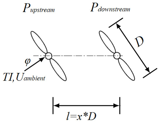 First, the factors that influence the turbine loads in a wind farm need to be identified. In order to identify the important factors, without loss of generality, a farm with two wind turbines (WTs) is considered (Figure 1). The turbine diameter is D, and its interspace l is given as a function of the diameter. The most important external factors with direct impact on the WT loading are the inflow wind characteristics: