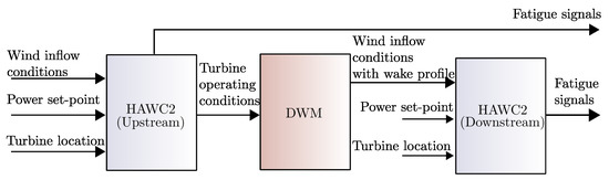 In this study, the HAWC2-DWM framework is utilised and a database is created, which serves as the basis for WT main component fatigue load prediction under various conditions in an array of turbines. Figure 2 depicts the HAWC2-DWM framework used in this work.