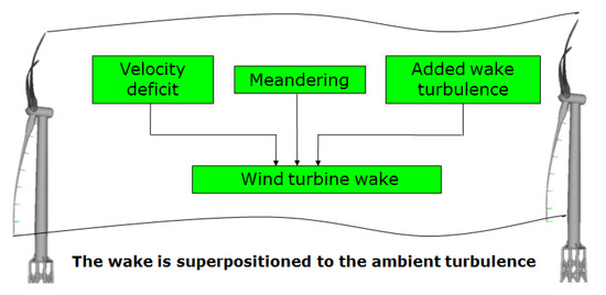 The DWM model captures the wakes generated by a wind turbine, where the wake is assumed to be transported downstream as a passive tracer by the large scale atmospheric turbulence structures. Three turbulence ‘boxes’ are used to model the overall change of the ambient turbulence based on the Mann model [24]. One large box with coarse grid size resolution (typically one rotor diameter) covers the entire wind farm and is used as the transport media of the wake deficits. The second turbulence box models the small eddies and micro-scale turbulence within the wake, and a third one covers the wind turbine rotor area for the ambient turbulence. The latter is the one that is also used in the simulations of stand alone wind turbines. The velocity deficit is extracted from the Blade Element Momentum (BEM) theory together with the boundary layer approximation of the Navier–Stokes equations. The DWM model takes into account the contribution of the strongest upstream WT wake up to rated (ambient) wind speeds, while summing linearly the upstream wakes for wind speeds above rated. As a result, for each turbine in a wind farm, the inflow wind field is a linear superposition of the ambient field, and any relevant wake deficit and induced small scale turbulence. Figure 3, which is taken from reference [18], illustrates how the wake effects are modelled.