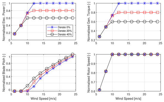 where is the power demand and is the rated rotor speed. The strategy ensures the rotor is operating at the maximum speed, thus reserving the kinetic spinning energy to support the power grid. As soon as the nominal rotor speed is reached, the blades are pitched towards feather to reduce the power to the desired level. This strategy is widely used in the literature (e.g. [26,27]). In Figure 4, the quasi-steady WT operational pitch angle and rotor speed, as well as the electrical power output and generator torque, are presented for different derating percentages. The results are normalised by the normal operation values at 24 m/s wind speed. The turbine controller increases the rotor speed as the wind speed increases until the nominal value, and then the pitch actuator turns the blade to feather in order to regulate the power.