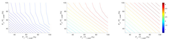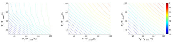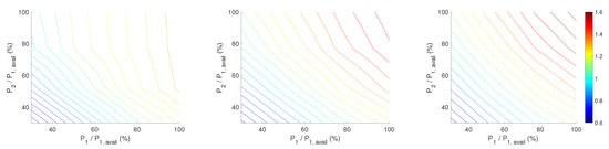 where the power output for each WT (, ) is constrained to the desired level as a function of nominal WT power (Equation (1)):