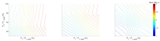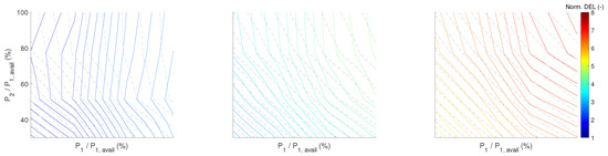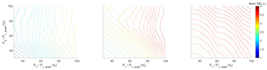 In Figure 9, Figure 10 and Figure 11, the sum of the normalised Tower Bottom Fore-Aft (TBFA) Damage Equivalent Loads (DEL) of the two turbine array are plotted with coloured contours as a function of WTs normalised power. The power normalisation is done with the available power of turbine one () at the given free wind speed. The grey dashed lines in the background denote contours of the same sum power output of the turbine array. These grey lines correspond to the plots of Figure 6, Figure 7 and Figure 8. In contrast, the fatigue load normalisation is done with the minimal total DEL of two turbines. Similar to Figure 6, Figure 9 presents results for three different incoming wind directions 0°, 10°, 22° from left to right plots at 8 m/s, 7% turbulence intensity and 5D turbine interspace. In Figure 10, the TI was varied (7%, 14%, 27%) from left to the right plots, while the other parameters were kept the same as in Figure 9. Similarly, Figure 11 shows results for different wind speeds (8, 12, 16 m/s) from left to right, while the other parameters were kept the same as in Figure 9.