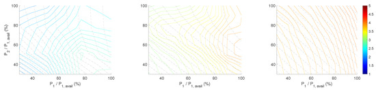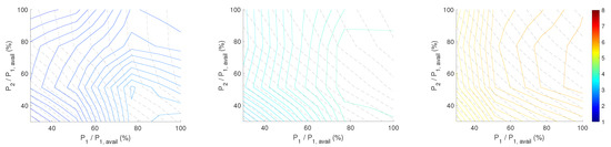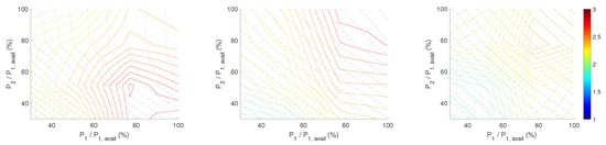 Impact of wind conditions and turbine power set-points on simulated sum BRF damage equivalent loads of two turbine array. Contour lines show sum BRF normalised loads. Ambient mean wind speed is 8, 12 and 16 m/s from left to right.