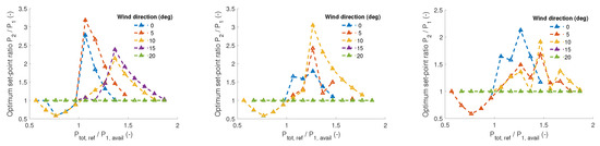 Optimum ratios of turbine power set-points as a function of total power reference for different wind directions and turbine spacing. The ambient wind speed is 8 m/s, turbulence intensity is 7% and turbine spacing is 5D, 7D and 9D from left to right subplots.