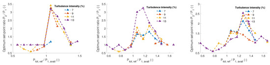 Optimum ratios of turbine power set-points as a function of total power reference for different turbulence intensity (TI) and turbine spacing. The ambient wind speed is 8 m/s, wind direction is 0 degrees and turbine spacing is 5D, 7D and 9D from left to right subplots.