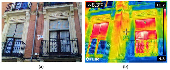 The building was selected by: (1) Being inhabited, so that there is a constant indoor temperature; (2) Having the brick masonry facade, without any other material; (3) Not having undergone restoration or rehabilitation, which may have modified the original composition of the brick wall; (4) Being in an environment with extreme temperatures, below 0 °C in winter, to work in the most unfavorable conditions, and with following permission to place the instruments to do the essay. The test is carried out in the blind area of the facade of which there is greater surface area and is not carried out in singular areas or thermal bridges because the methodology used is better adapted [24].