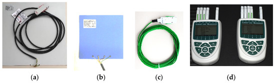 (a) Thermal flow plate placed inside; (b) thermal flow plate placed outside; (c) thermocouple; (d) data logger.