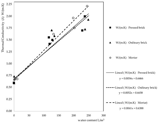 Subsequently, the thermal conductivity coefficient values obtained, in the wet state, were compared with those obtained by applying the formula of EN ISO 10456 [20], which indicates that the conversion of thermal values from one set of conditions to another set of conditions is performed according to the following expression: