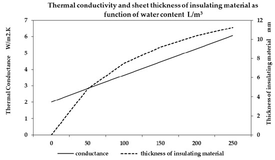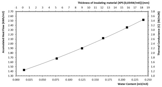 The result of the calculations has been transferred to Figure 4, where the water content of the facade has been represented on the ordinate axis, the value of the thermal conductance of the facade enclosure studied is on the primary abscissa axis, and thickness of the insulating leaf necessary to maintain thermal insulation when the facade is wetted is on the secondary abscissa axis. To analyze this result, it should be taken into account that the thermal conductance of this facade is the same as a leaf of 17-mm insulating material.