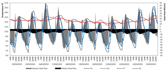 The in situ test on this facade wall was carried out for 13 days, according to the methodology of the International Standard ISO 9869-1 [25], specifically between 13 and 25 March 2019. It is of a north-facing facade with a slight deviation to the east. This orientation was chosen with the intention of preventing the direct incidence of the sun from having a significant influence and so that it could cause alterations of the flow and surface temperatures (sun-air temperature). Of the 13 days of testing, 11 have been selected discarding the first and the last, because they are not full days and because of the small interferences that could exist during the assembly and disassembly of the measuring equipment.