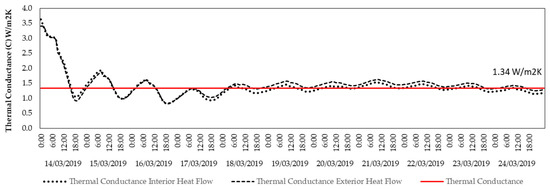 It also allows to evaluate the thermal demand due to the heat transmission through the external enclosures, data that are necessary to know for energy rehabilitation actions. With the values of the thermal flow of the plates located inside and outside, and the interior and exterior surface temperatures, applying the formula (5), the value of the thermal conductance of the facade can be estimated, as can be verified in the graph in Figure 6.