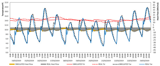 The first simulation was carried out to verify if for the same conditions the results offered by the program are similar to those of the in situ test. To perform this simulation, it has been assumed that the water content of the wall is different in the pressed brick outer leaf. The outer leaf contains about 15 L/m3 with a thermal conductivity λ = 0.74 W/(m.K), and the inner leaf is dry with some humidity due to the absorption of about 4 L/m3 from the environment with a thermal conductivity λ = 0.66 W/(m.K). Figure 7 shows the simulation values.