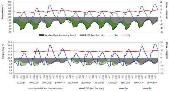 Once the simulation has been validated by comparison with the results of the “in situ” test, other simulations have been carried out to analyze the thermal flow step when the facade is moistened with rainwater or with water rising from the ground. The comparative results of flow during the test and the flow in the two described situations of humidity by rainwater and humidity rising damp, have been transferred to Figure 8.